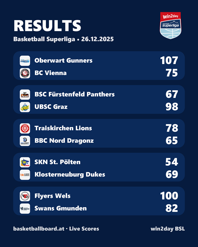 Die Christmas-Games der 15. Runde lieferten starke Bilder, klare Ergebnisse und deutliche Worte. Flyers Wels untermauern ihre Tabellenführung, die Gunners zeigen eindrucksvoll ihre Tiefe, UBSC, Lions und Dukes setzen wichtige Akzente – und die Basketball Superliga geht mit viel Energie in die nächste Saisonphase.